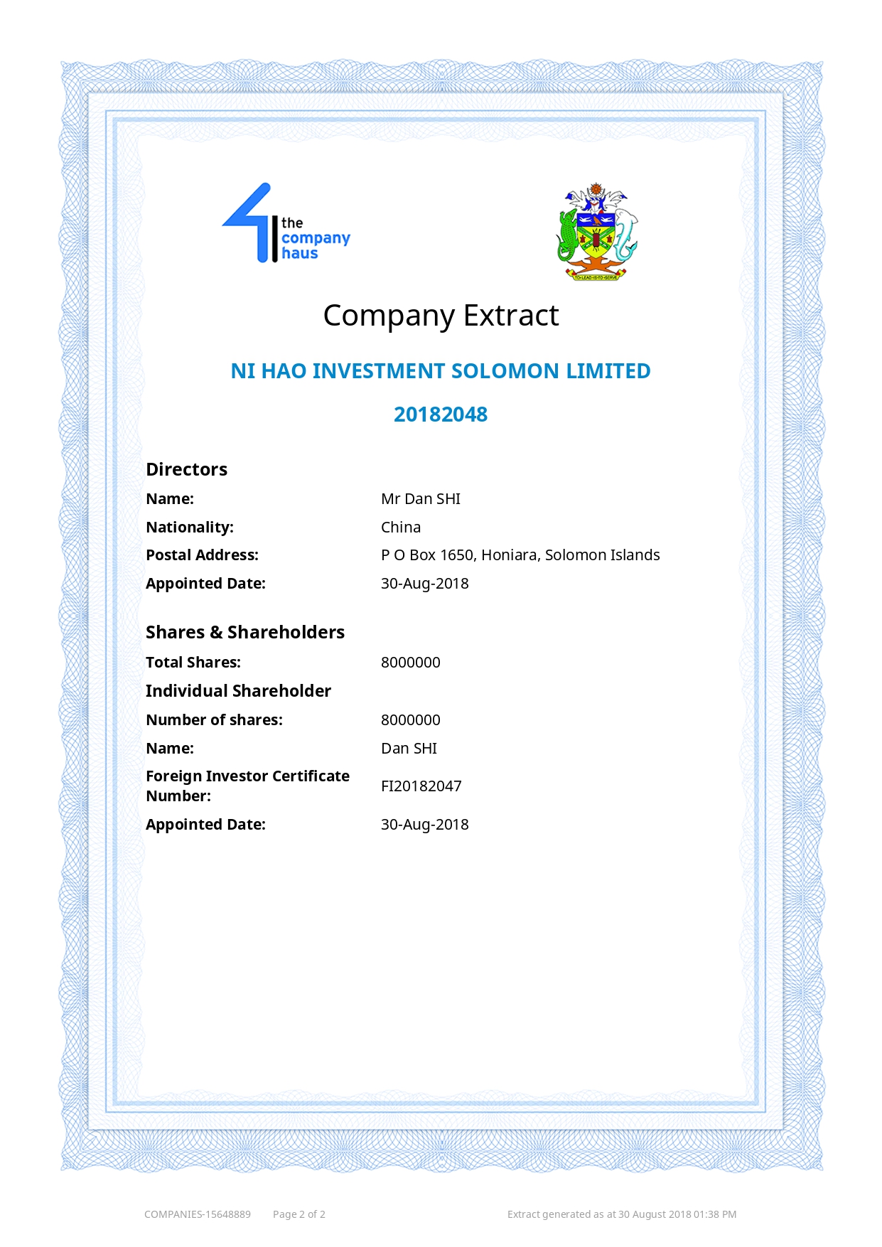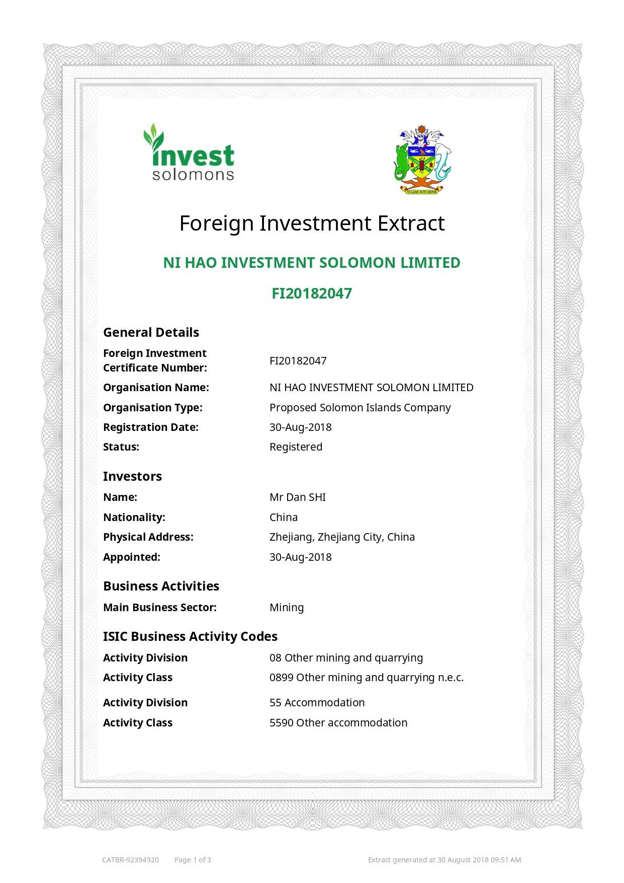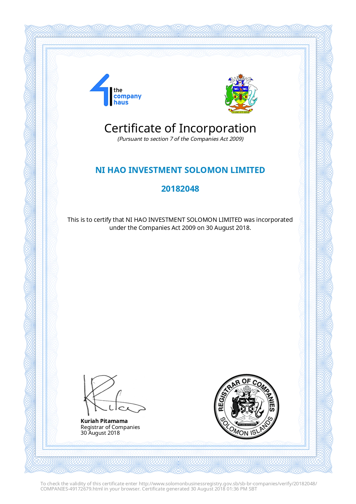 NIHAO INVESTMENT SOLOMON LTD. is a Chinese enterprise founded in 2018, focusing on the