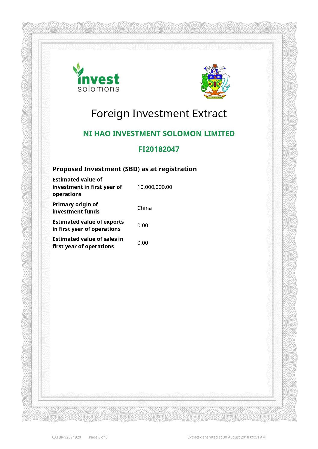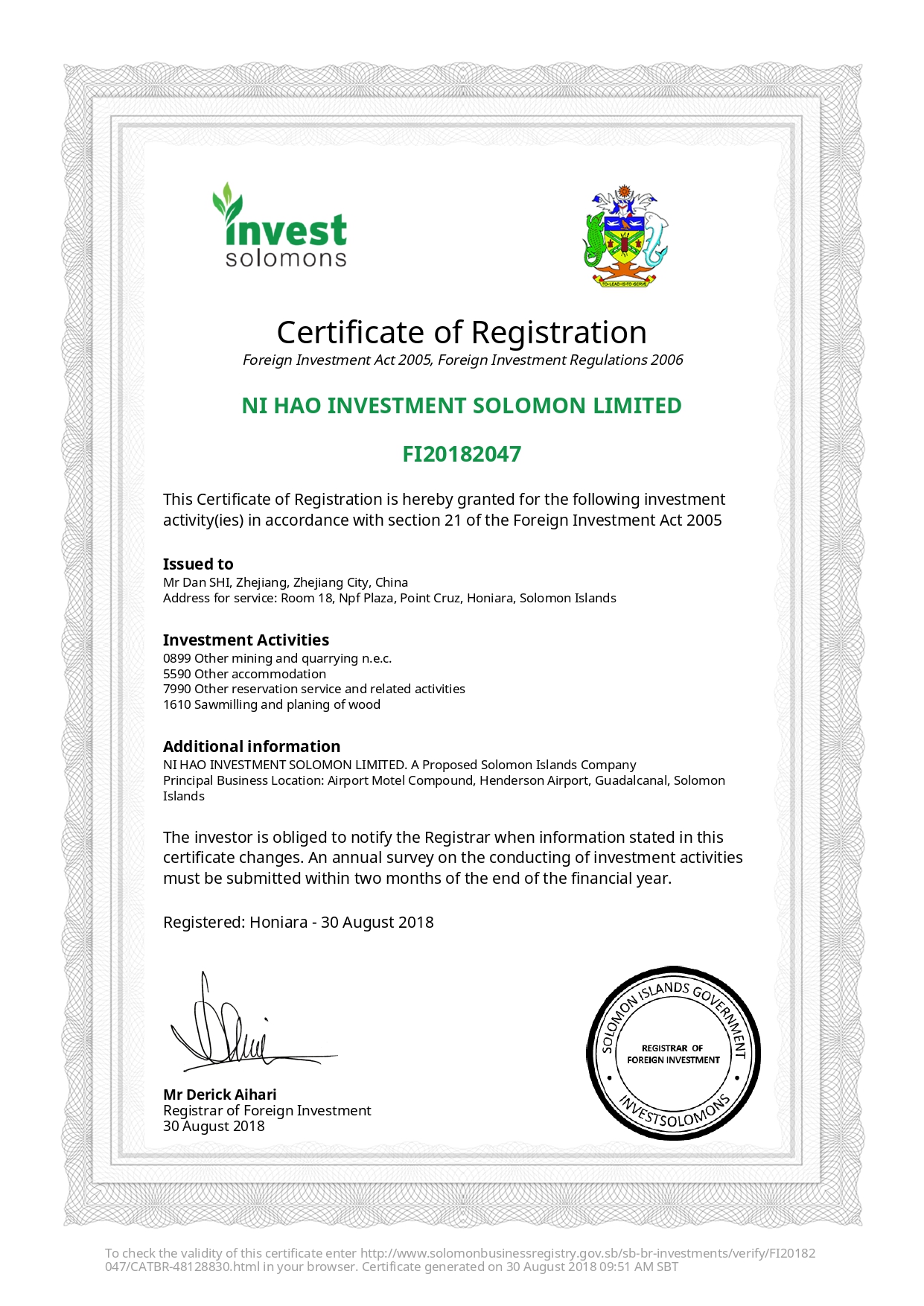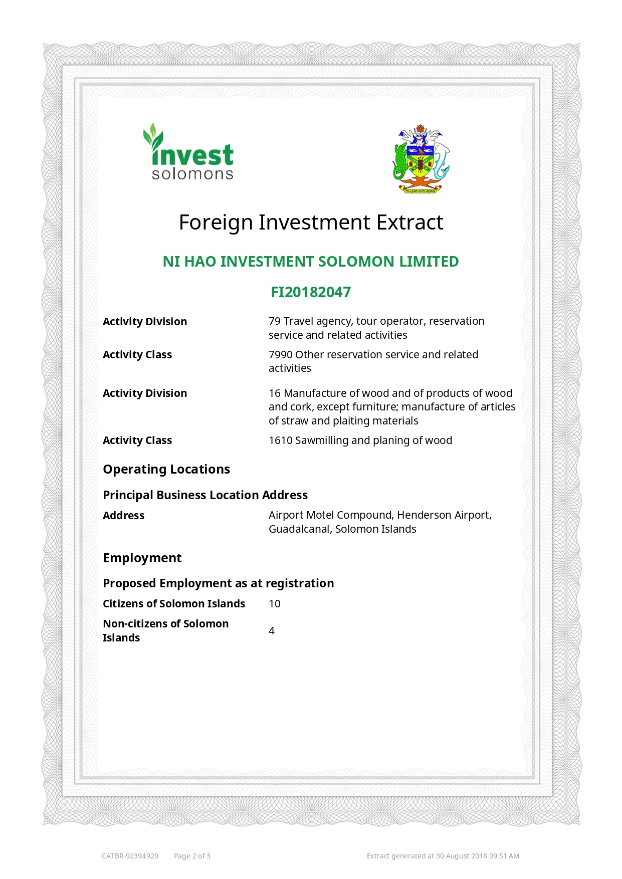NIHAO INVESTMENT SOLOMON LTD. is a Chinese enterprise founded in 2018, focusing on the