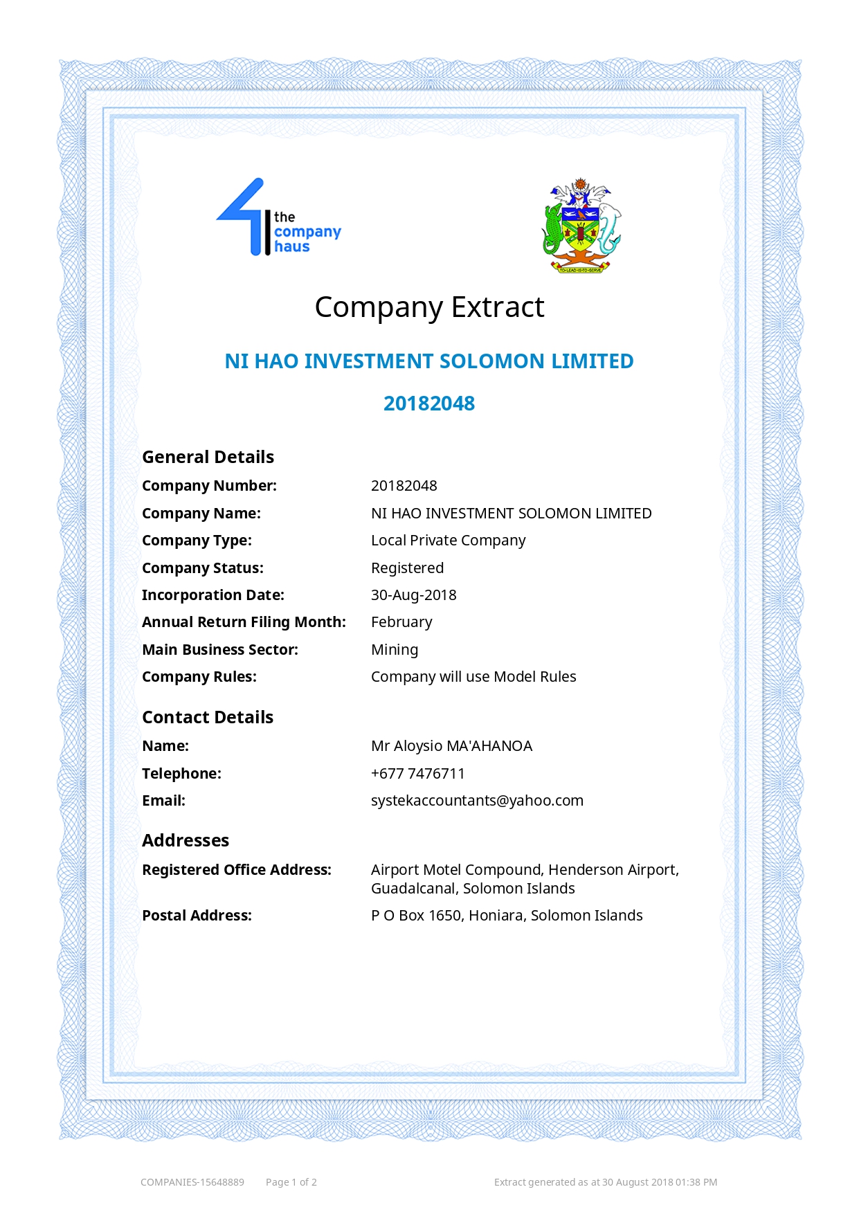 NIHAO INVESTMENT SOLOMON LTD.是⼀家成立于2018年的华人企业,公司专注于所罗门群岛铜矿的勘探与