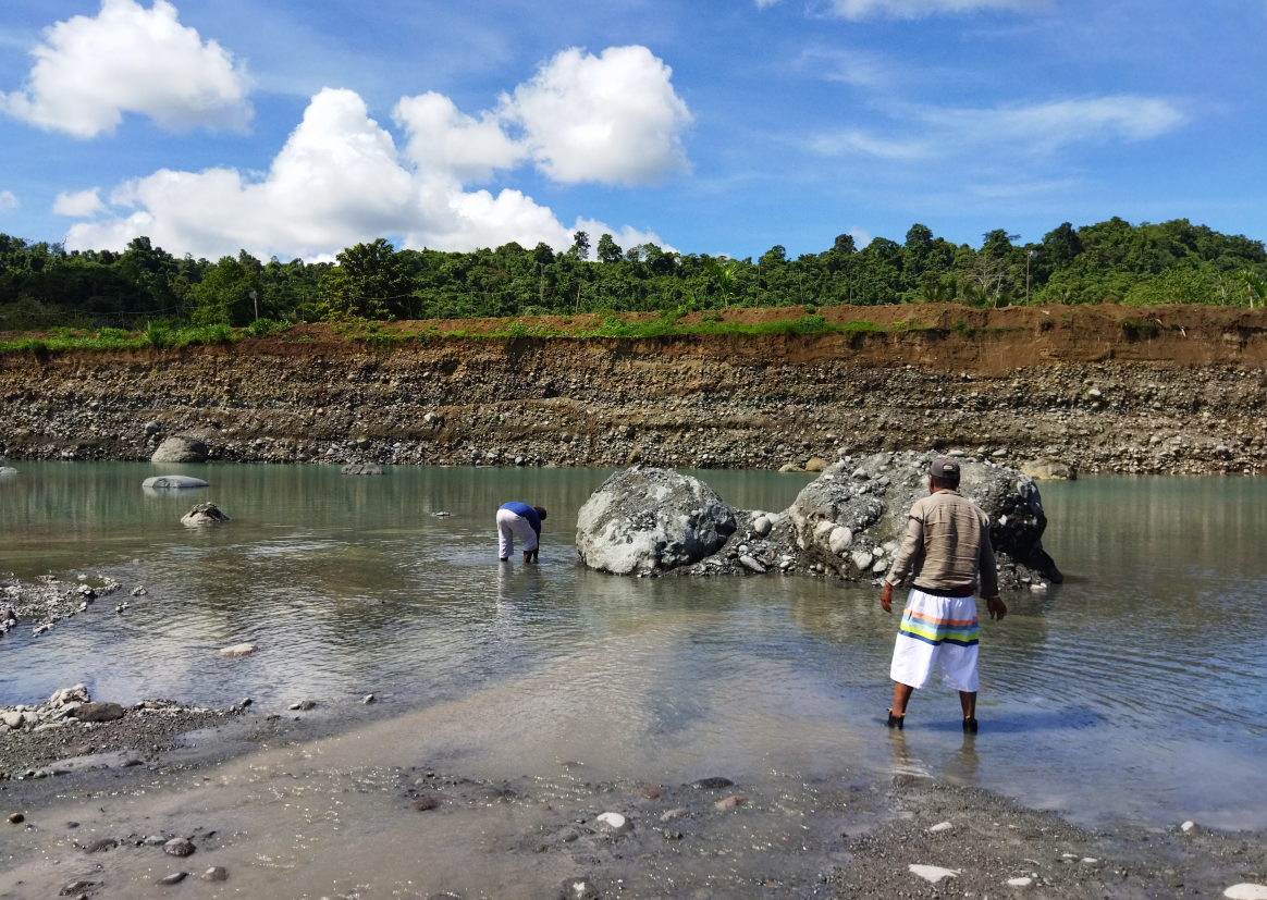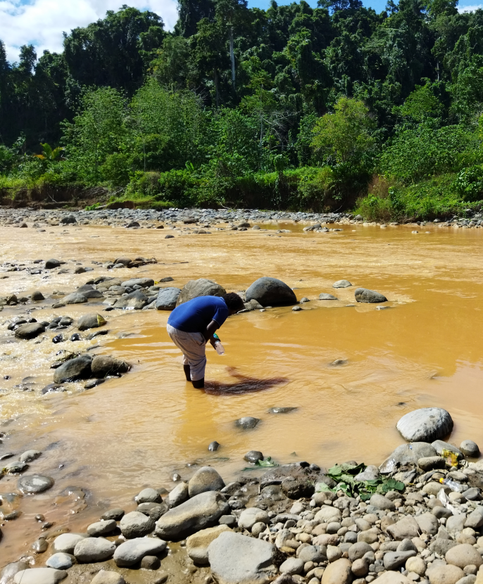 官员们从河流(左侧)和我们的工作坑区域(顶部)抽取水样进行分析